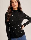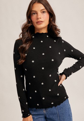Flower Embroidered Mock Neck Cabbage Hem Rib Top