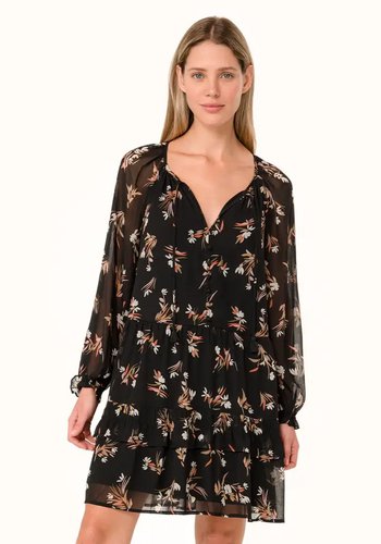 Flowy Floral Long Sleeve Tie Neck Mini Dress